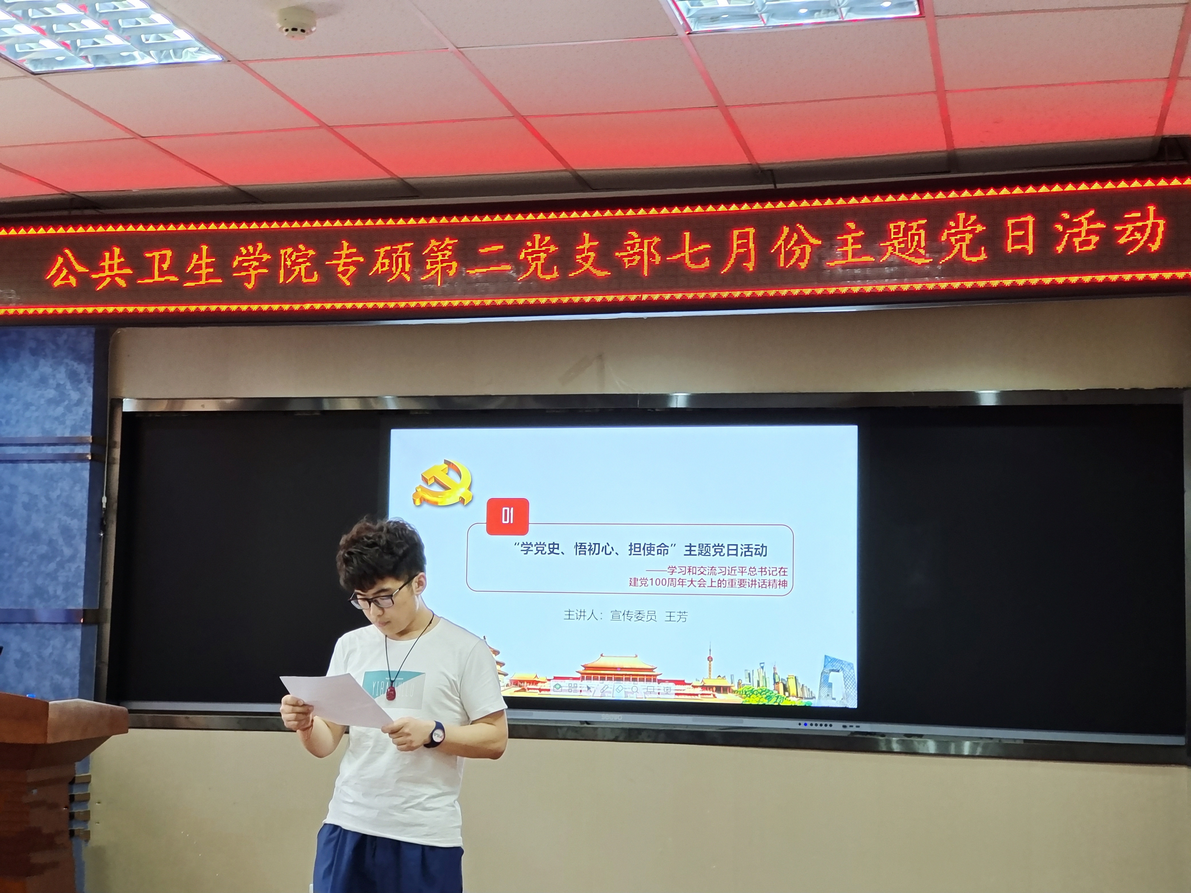 为进一步深入贯彻落实党史学习教育,将“学史明理、学史增信、学史崇德、学史力行”走深走实,7月7日晚,专硕第二党支部“学党史、悟初心、担使命”主题党日活动暨第三季度党员大会在城关校区东区勤博楼4008会议室召开,会议由支部副书记曾帅同志主持,全体党员参加。