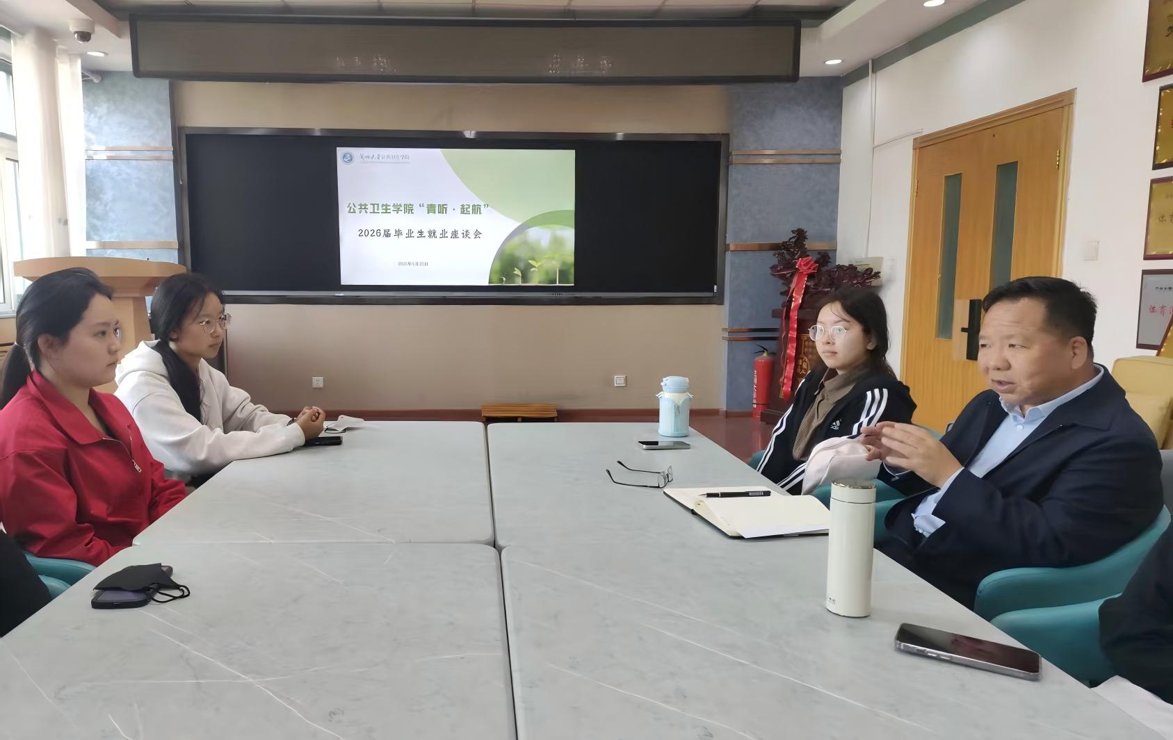 近日,公共卫生学院组织开展“青听·起航”2026届毕业生座谈会,以8-10人小组形式实现本科毕业生全覆盖座谈,精准对接学生升学、求职需求。学院党委书记胡万军、副书记马恩和及各年级辅导员全程参与,精准护航学生升学求职。