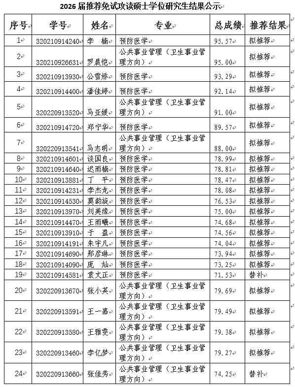 根据《兰州大学2026届推荐优秀本科毕业生免试攻读研究生工作办法》和《公共卫生学院2026届推荐优秀应届本科毕业生免试攻读研究生实施细则》规定,本着公开、公平、公正原则,现将学院2026届推荐优秀应届本科毕业生免试攻读研究生选拔结果公示如下: