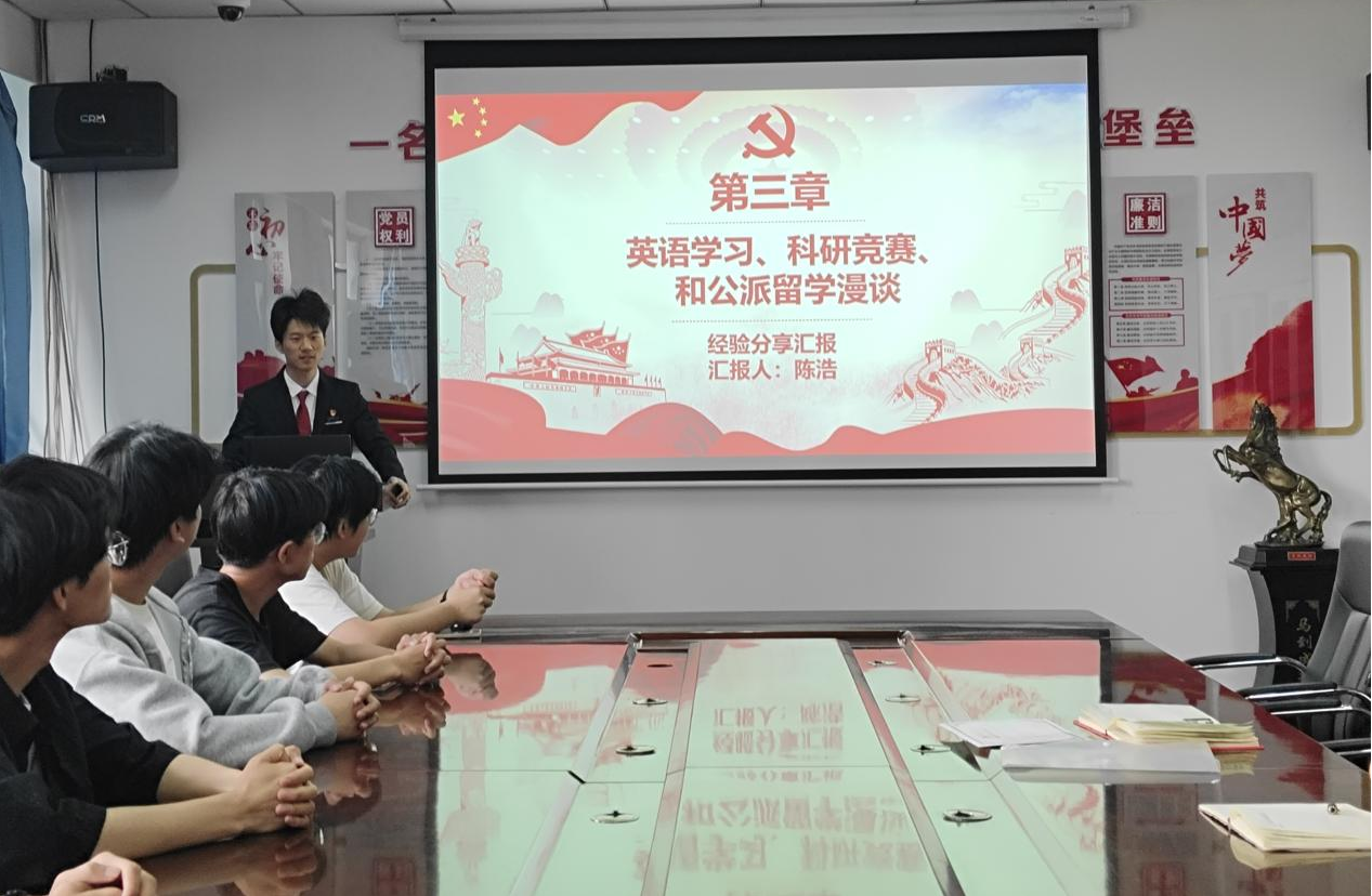 研究生党员陈浩首先作自我介绍,并围绕“英语学习”“科研竞赛”“公派留学”等主题展开经验交流,为大家分享了学习上的宝贵经验和实用的英语学习软件,同时结合自己参与科创竞赛的经历,强调参赛中可能存在的痛点问题和应对技巧,以及介绍了公派留学的相关政策,呼吁同学们积极了解以便后期参加。他结合自身经历,提出“乐于助人”“用功读书”“勇于尝试”三点建议,强调学术探索需兼具踏实态度与创新精神,并以“青出于蓝而胜于蓝”寄语本科生,传递了党员先锋的担当与期许。